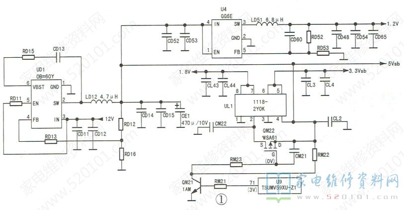 UD1把12V电压转换成5Vsb电压,UL1把5Vsb电压转换成3.3Vsb和1.8V。U4把5Vsb电压转换成1.2V。通电后,开关电源输出12V电压加到UD1的③脚,UD1的⑤脚(使能端)通过电阻RD11与12V相连,芯片得电工作,②脚产生幅度约12Vp-p的脉冲电压,如图2所示。
