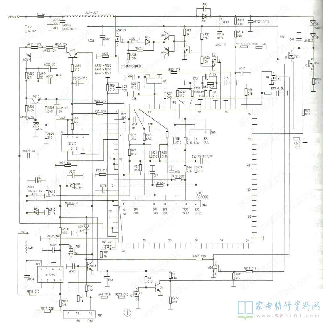 该型背光板的供电为24V,电压通过保险丝F1后,第一路供给U10的23、24脚。第二路经AR12、AR13限流,由ZD3稳压成4.8V电压供控制电路。第三路送给以AU3(RT8289 )为核心的DC-DC电路,输出5V电压,供给U10的18、19、26脚。AR48和AR44、AR17是稳压取样电阻。AU3的⑤脚是使能(EN)端,该脚高电平启动。待机时,AR53给AQ7的G极提供偏置电压,AQ7导通,使AU3的⑤脚呈低电平,AU3不工作。第四路经AQ9供给由AQ10和AQ14组成的12V线性稳压器。AQ9导通与否由AQ2和AQ13控制,即由主板背光开启信号(EN )控制。