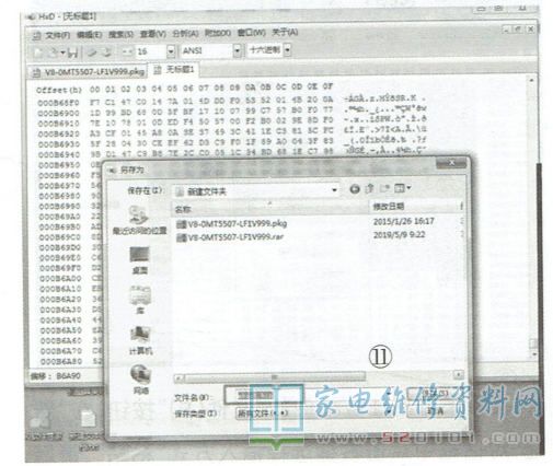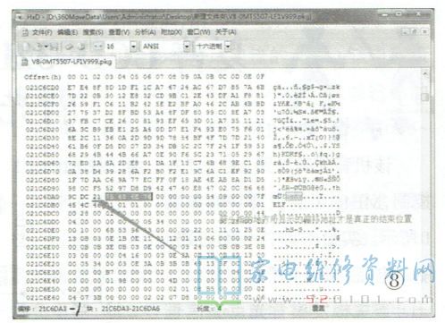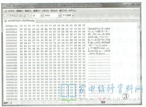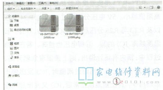 首先要在电脑中安装好十六进制编辑软件,如WinHEX或者HXD等,然后找到该型彩电的强制升级包( 本地升级包不可以),例如V8-OMT5507-LF1V999.rar,最后将压缩包解压得到V8-0MT5507-LF1V999.PKG文件,如图1所示。