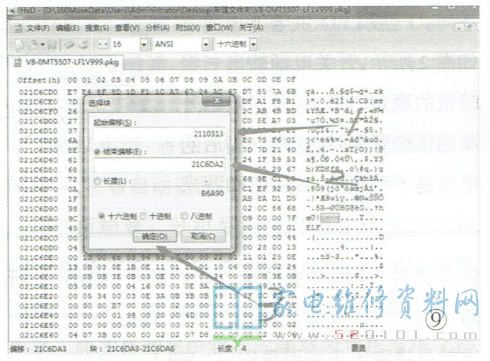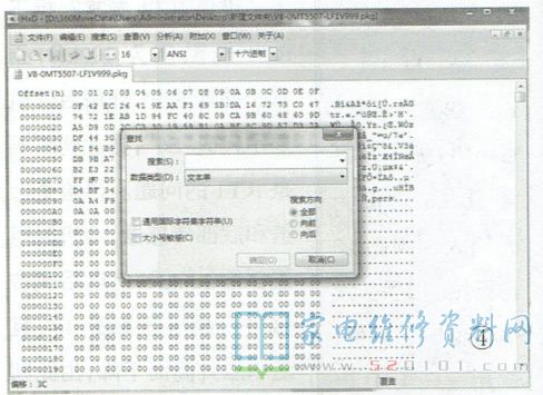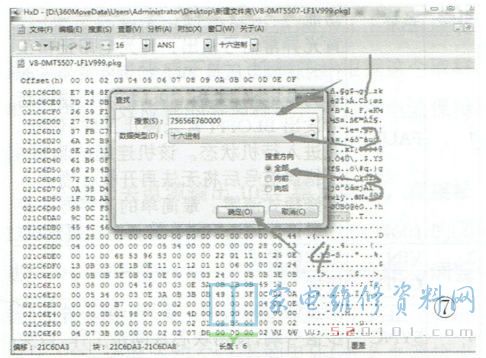 文件不同,偏移地址也不同。记下此处的偏移地址,以便后面使用。在"搜索(S)"后面的方框中输入MTK引导程序结束特征码“75656E760000”,其他选择同上,如图7所示。