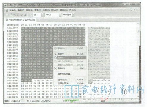 须说明的是,搜索结果要减去1才是真正的偏移地址,并且需要记下此结果,以便后面再次使用。点击任务栏中的“编辑(E)"按钮(或者用快捷键“Ctrl+E"),这时出现“选择块”对话框,输入前面记录的偏移地址,起始偏移地址“2110313”,引导结束偏移地址“21C6DA2”,如图9所示,再点击“确定(O)”按钮后,用鼠标选择蓝色区域,点击右键选择“复制(C)",如图10所示。
