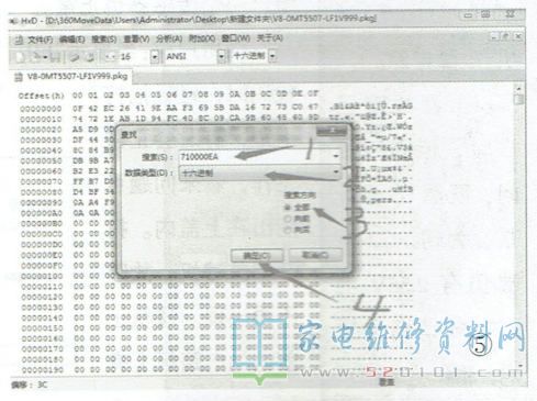 这时在“搜索(S)"后面的方框中输入MTK引导程序起始特征码“710000EA”,然后点击“数据类型(D)"按钮,再选择“十六进制”;“搜索方向”选择为“全部”,最后点击“确定”按钮,如图5所示。