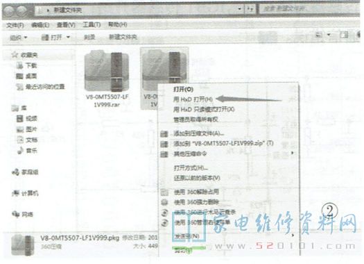笔者以HXD软件为例选中V8-0MT5507-LF1V999.PKG文件,点击右键,选择“用HXD打开(H)" ,如图2所示。