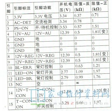 检修提示:电源板单独工作方法有:(1)断开电源板上所有连接线(AC输入除外);(2)将插座CN201的①脚(3.3V)与③脚(PS-ON)短接;(3)将插座CN201的①脚(3.3V)与⑤脚短接;(4)将CN301接上负载;(5)将CN201的①~②脚同时与①脚短接;(6)检测CN201插座输出电压有3.3V、12V-AU、 12V-REG、12V-TCON等。