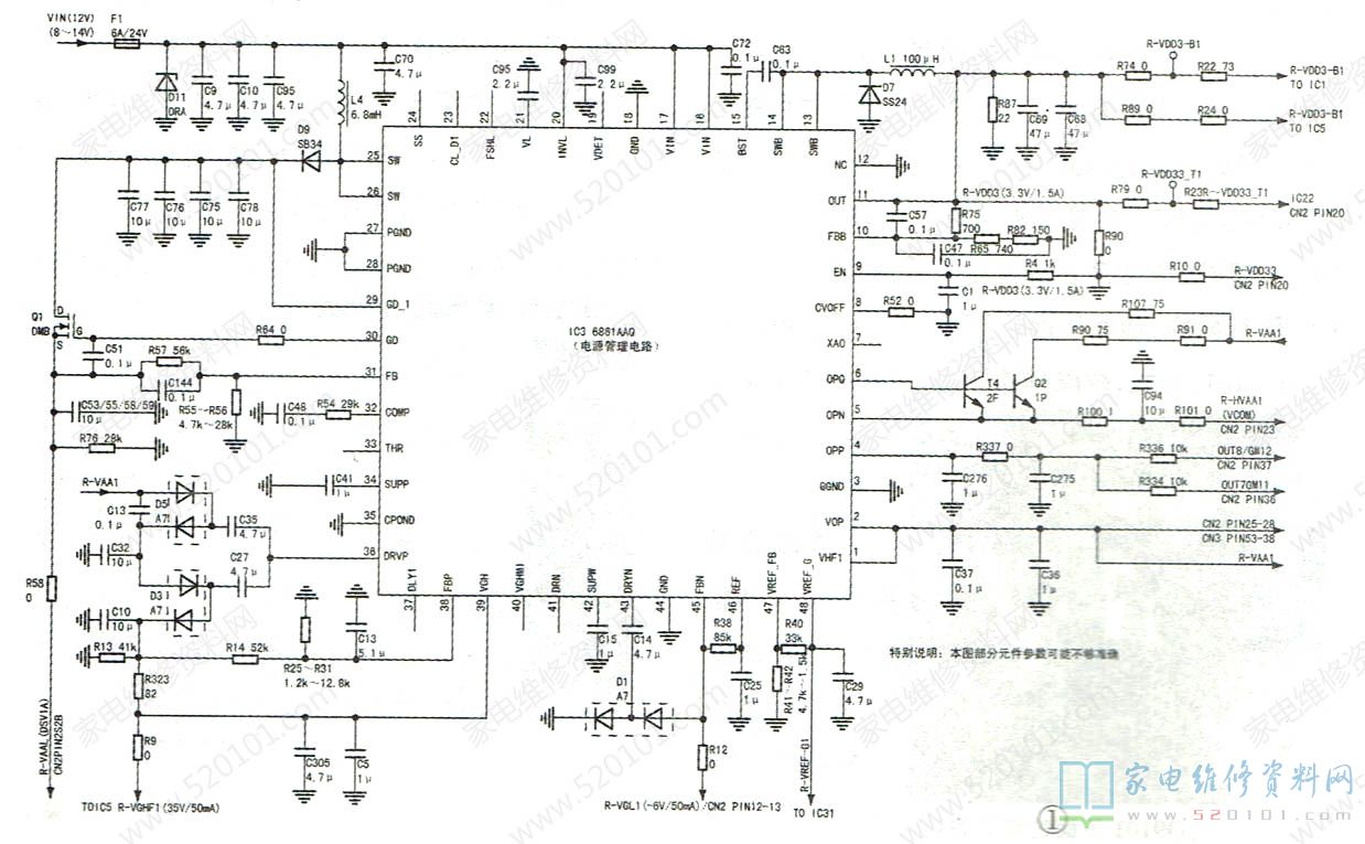 该板的电源管理电路如图1所示,IC3( 6861AAQ )是电源管理芯片。当IC3的20脚得到VIN供电(供电范围8V~14V,典型供电12V),并经21脚内部电路滤波、稳压后,芯片内部电路得电工作。若此供电超过欠压锁定检测电路的阈值,内部的降压稳压电路启动,振荡电路经软启动后开始振荡,降压稳压电路随即正常工作,得到R-VDD33供电(典型值3.3V/1.5A)。
