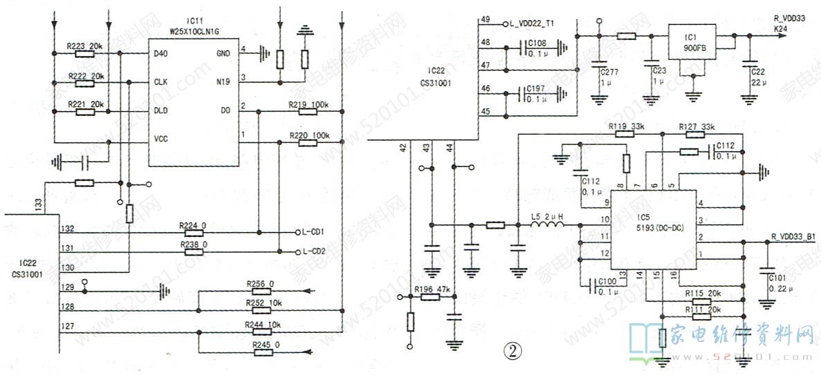 当电源管理电路正常工作后,R-VDD33先经IC1稳压成L-VDD18,R一VDD33_B1先经IC5变换成L-VDD12_ T1,然后供给IC11及IC22。当时序控制集成电路IC22的各供电引脚得到相应的供电后,IC22内部电路复位,外围的晶振IC13振荡,内核电路启动工作( 会运行IC11内部的程序),之后在IC信号(127、128脚)的控制下进入正常工作模式。主板送来的V-by-One信号经I2C内部的缓冲、串行并行变换、格式化(yCbCr到RBG)及输出缓冲后,从相应引脚输出数字视频信号、同步信号及时钟信号,经CN2、CN3送往行、列驱动电路,最后送给TFT,显示出图像。