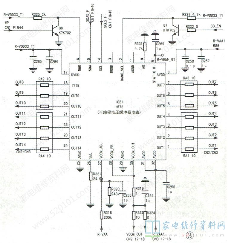 该板伽马电压缓冲电路如图3所示,IC21(1572 )是可编程伽马电压缓冲器。当电源管理电路给IC21的8、31、32脚送来R-VAA1供电,给17脚送来R-VDD33_ T1供电后,I2C (14、15脚)、NWR(16脚)、A0(10脚)信号的控制下,IC21内部电路工作;在⑨、12脚信号的控制下,①~⑦、18~24脚输出伽马电压给源极驱动电路,以进行伽马校正。