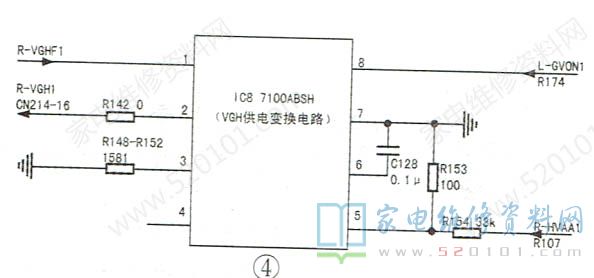 该板VGH供电变换电路如图4所示,IC8(7100ABSH)是vGH供电变换集成电路。IC8的⑤脚得到R-HVAA1供电后,内部电路工作在默认状态。当IC8⑧脚输入L-GVONI信号后,IC8①脚输入的R-VGHF1供电经内部电路变换,从②脚输出R-VGH1供电,为栅极驱动电路的输出缓冲器供电。