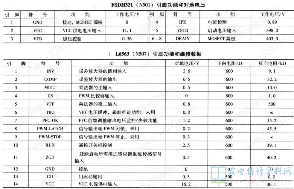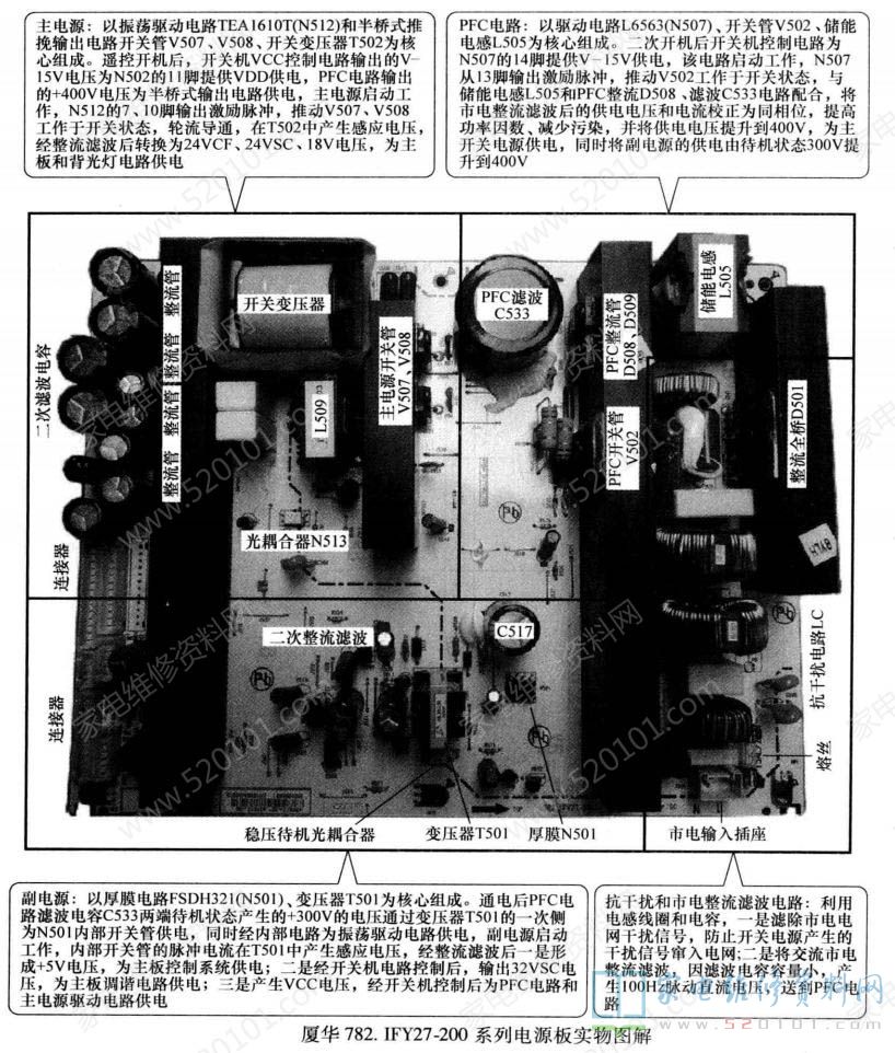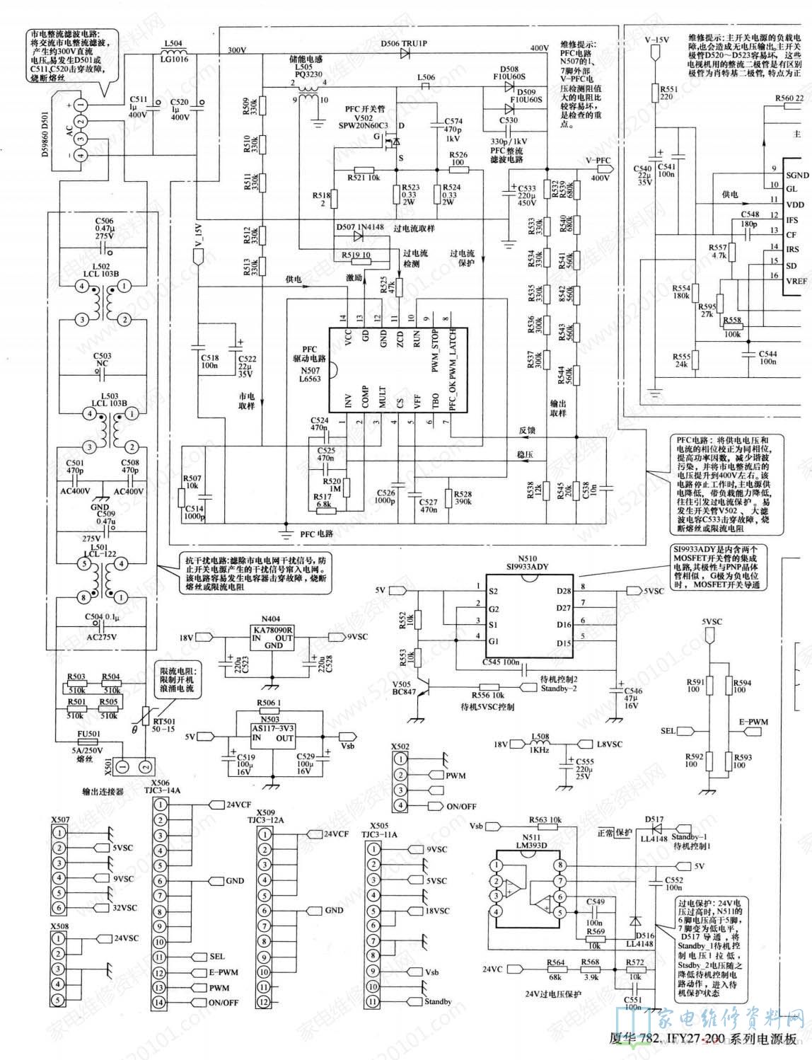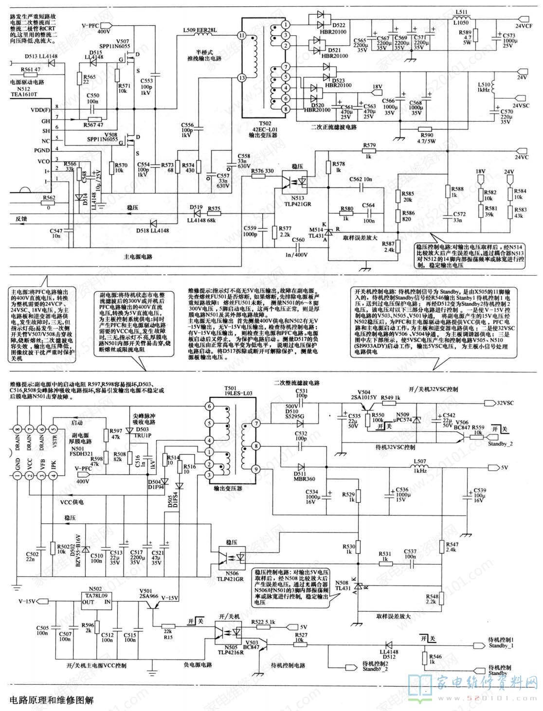 该系列电源板由三部分组成:一是以厚膜电路FSDH321 (N501) 为核心组成的副电源;二是以驱动控制电路L6563. (N507) 和大功率MOSFET (开关管) V502 为核心组成的PFC电路;三是以驱动控制电路TEA1610T (N512)和大功率MOSFET (开关管) V507、 V508 为核心组成的主开关电源。开关机控制采用控制PFC电路和主开关电源驱动电路vCC供电及控制主板32V、5V电源的方式。
