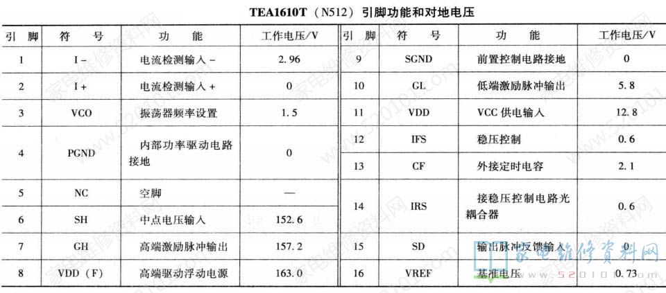 通电后,市电经整流滤波电路产生+ 300V电压,再经PFC电路产生V-PFC电压,该电压待机状态为300V,开机状态上升到400V,为主副电源供电,副电源NS01首先启动工作,为主板控制系统和待机控制电路提供+5V电压,控制系统工作后为电源板送人待机高电平控制电压,待机控制电路动作,-是将副电源产生的VCC电压送到PFC驱动电路N507和主电源驱动电路N512,PFC电路和主电源启动工作,向主板和逆变器板提供24VCP、24VSC、18V 电源;二是将副电源产生的32V电压送到主板调谐器;三是将副电源产生的5V电压转换为5VSC受控电压,为主板小信号处理电路供电,整机进人开机收看状态。该电源板设有24V输出过电压保护电路,发生过电压故障时,保护电路启动,将待机高电平拉低,进入待机保护状态。该电源板的集成电路引脚功能和维修数据见表1~表3。