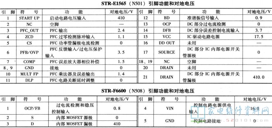 PFC电路不工作,C519、C520正端电压降为300V左右。由于PFC电路和18V主电源共用驱动电路STR-E1565,根据工作原理,若内部PFC逻辑电路出现故障,将造成18V主电源不能启动。由于主电源各输出电压正常,只是C519、C520正端电压始终为300V左右,一是检查STR-E1565的3脚外接的缓冲及功率放大电路是否出现故障;二是检查STR-E1565的4脚的过零检测脉冲输人电路是否出现故障;三是检查STR-E1565的10脚外接的高次谐波输人电路是否出现故障。