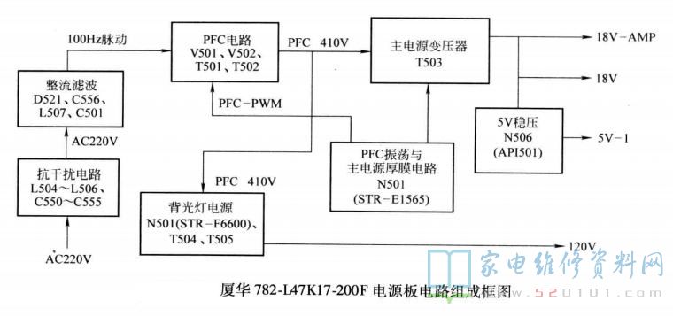 AC220V市电整流滤波后经D502产生约300V的电压,为STR-E1565组成的PWM主开关电源供电,主开关电源首先启动工作,同时向PFC电路提供激励脉冲,PFC 电路进人工作状态,将300V电压提升到410V左右,一是向 主开关电源供电,向负载电路提供18V-AMP、18V和5V-电压;二是向背光灯电源电路供电,向背光灯逆变器板提供120V电压。