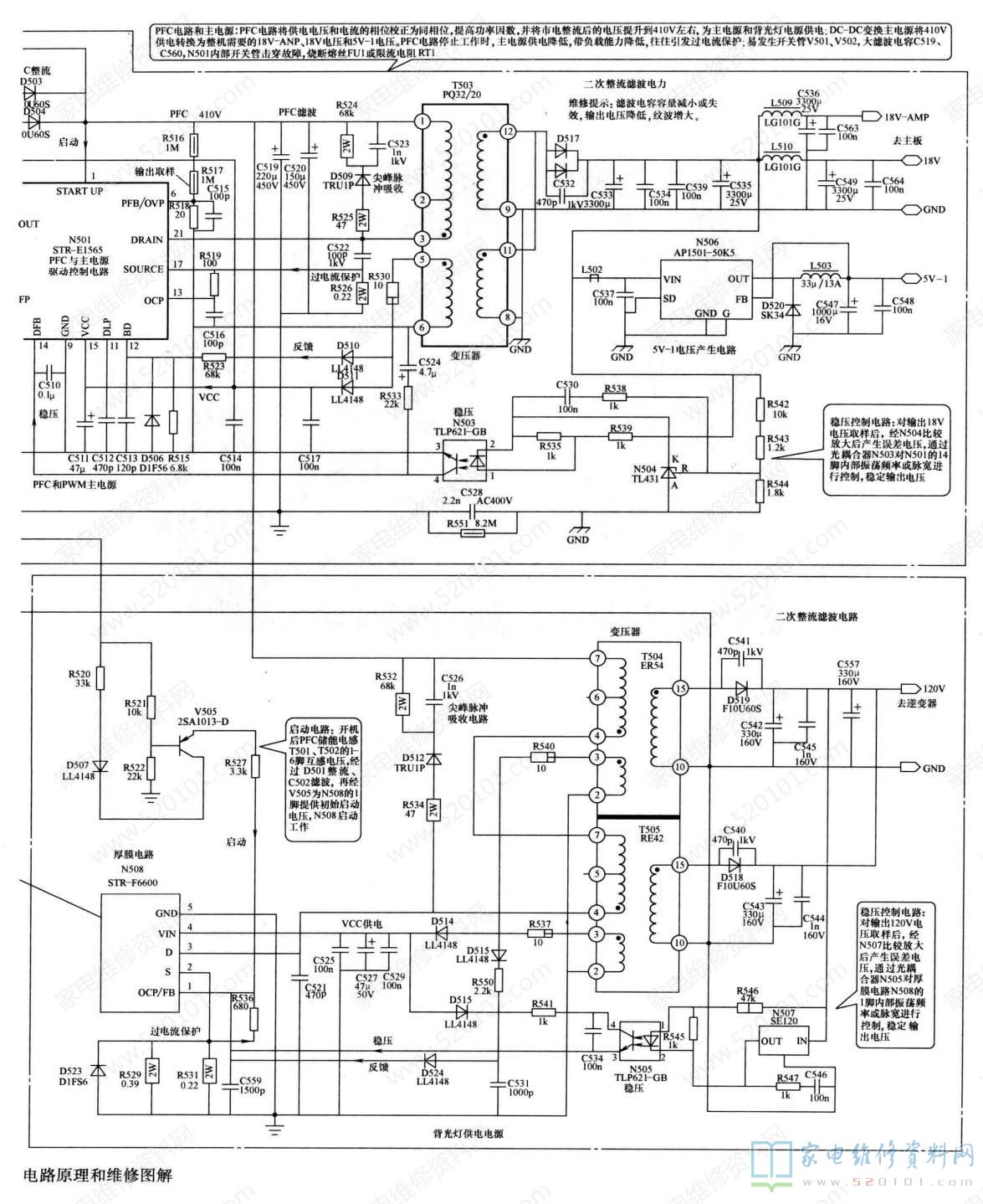该电源板集成电路采用STR-E1565 + STR-F6600组合方案。该电源分为三部分: 一是以驱动控制电路STR-E1565 (N501) 的1/2和大功率MOSFET ( 开关管)V501、V502为核心组成的PFC电路,将整流滤波后的市电校正后提升到410V左右,为主开关电源和背光灯电源供电;二是以驱动控制电路STR-E1565 (N501) 的1/2和内部大功率MOSFET (开关管)为核心组成的PWM主开关电源,为负载电路提供18V-AMP、18V 和5V-1电压;三是以驱动控制厚膜电路STR-F6600 (N508) 为核心组成的背光灯电源,为背光灯逆变器电路提供120V电压。
