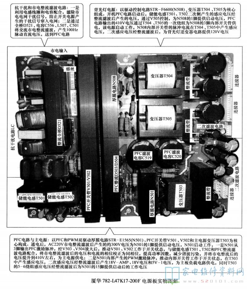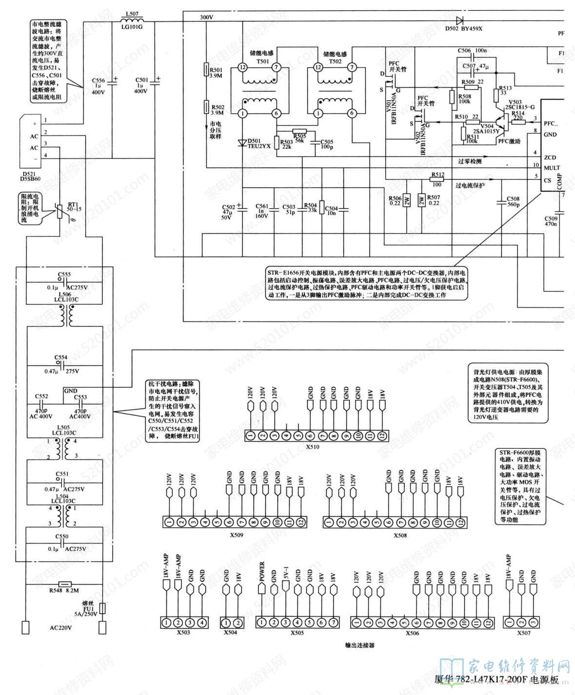 厦华40in以上大屏幕液晶彩电采用的型号为782-147K17-200F和782-147W17-200C的电源板,两者电路组成基本相同,应用于厦华LC-42T17、LC-42T18、 LC-47R27、 LT-47R26、LT47W17S 等大屏幕液晶彩电中。本节以782-147K17-200F为例,介绍其维修资料和维修图解。 厦华782-147K17-200F电源板实物图解如图1所示;电路组成框图如图2所示。
