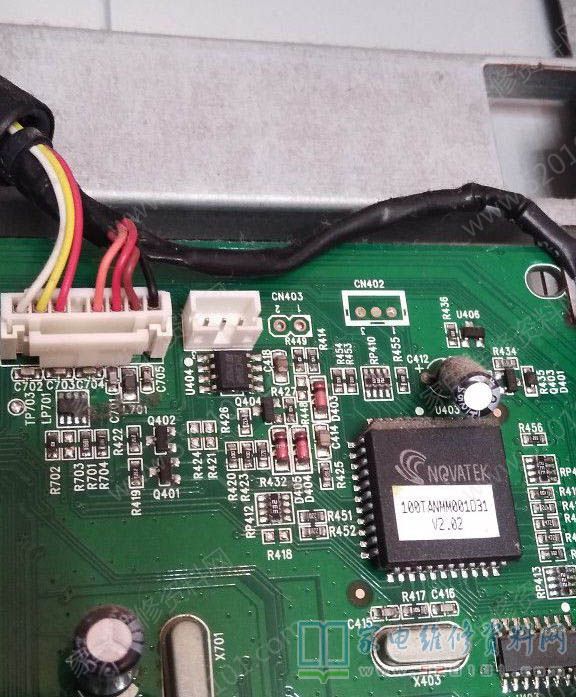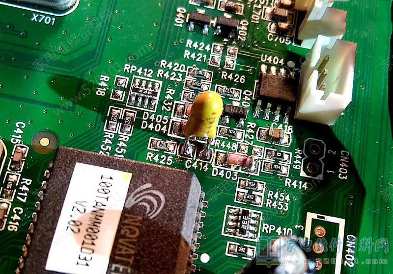 测量遥控接收子板的遥控输出信号端,电压3点多伏,在按遥控开机键时,电压有波动,由于原机遥控器丢失,现用机顶盒遥控器学习了原机电源键进行控制,不确定此遥控器是否可靠。再检测按键子板,电源电压正常。关电源,测电源键按下时微动开关接触电阻,电阻达十几欧,开机后,直接短路电源键的微动开关,还是无法开机。于是将故障范围定位到CPU及其外围电路。