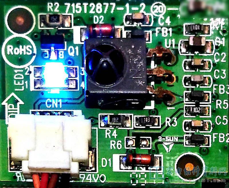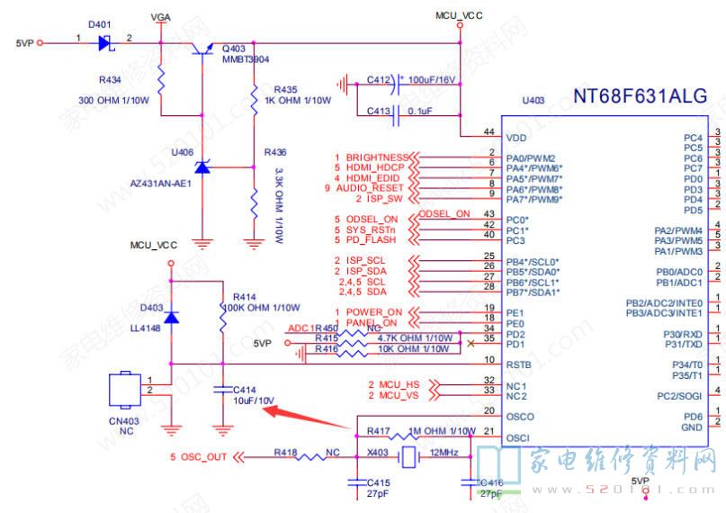 由于本人是非专业维修人员,没有相关维修经验,于是先在网络上搜索,发现有师傅检修时通过刷软件解决,由于没有刷机工具,只好先放弃。通过查看电路图,CPU有个开机复位电路,复位电容C414为10V/10uF,再对照电路板,发现电容类型为贴片陶瓷电容。测复位端对地电阻不到100欧姆,拆下后再测电容容量8uF左右,但直流电阻只有100欧左右,说明漏电严重,用一个钽电容替换后,按电源键时待机灯变为蓝色,PS-ON输出为5V,故障修复。