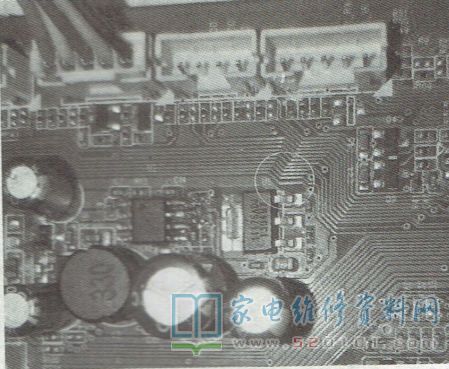 根据故障现象分析,判断待机电路出现故障。找来一块报废板,拆除板上的插座、电解电容、电感等大型元件,查看STB信号走向,发现STB信号分两路:一路接R1和C10,送到电容E11的正极;另一路通过一只电阻R10与一过孔相连,拆下主芯片测试,发现该过孔与主芯片A10脚相连,在测试中当测U2(AIC2857F)⑦脚电压时,竟然开机了。让机器处于待机状态,按开机按钮,无法开机,再测U2⑦脚又可开机。u2⑦脚通过电阻R15(100k)过孔到主芯片L5脚,测量U2⑦脚电压为3.34V,正常,R15也正常。既然测量u2⑦脚电压能开机,能否模拟一个信号开机呢?笔者找来一只500k的可调电阻,串联在R15上,先让机器处于待机状态,然后慢慢调小阻值,当调至400k时,机器开机。找来一只510k的贴片电阻,替换R15后试机,如图1所示,故障排除。估计故障原因是主芯片启动电路异常。