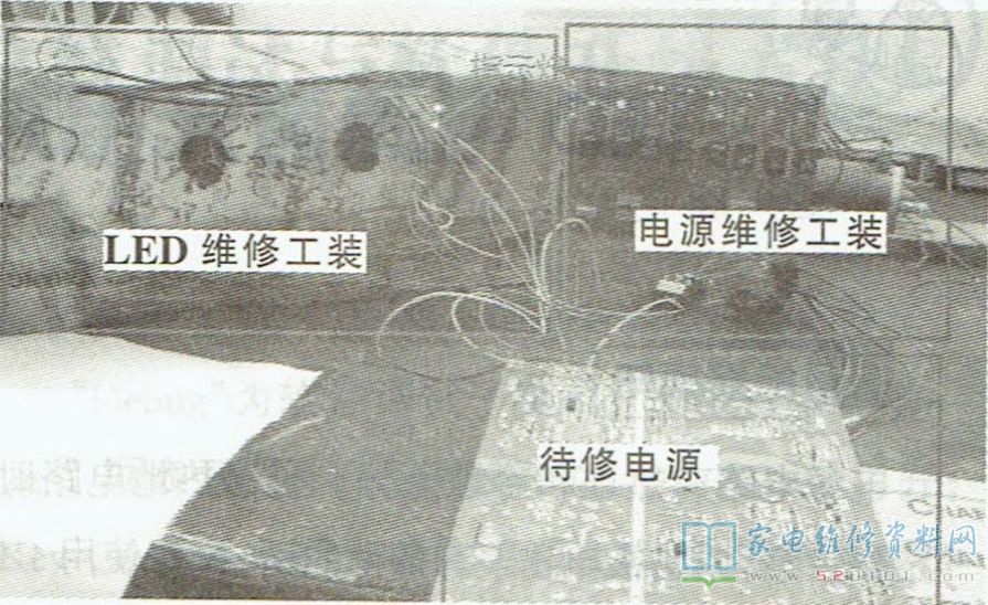 故障现象2:背光亮一下就熄。首先在开机瞬间观察屏上的亮暗情况,如局部亮或暗,表明对应驱动电路有问题,或对应LED灯串有故障。对于多路驱动的,可以交换驱动信号,看亮暗位置是否改变。如没有改变,则是LED背光故障;如位置改变,则表明LED驱动电路对应恒流驱动有故障。如是单路LED,一般是LED灯串有问题,或者oVP保护电路误动作。对有多路LED-端的背光电路,在背光没有熄灭前,测量LED-端的直流电压,并比较各路电压大小,正常情况下,电压相差不大。如电压相差较大,多为对应的LED灯串有灯珠短路或开路现象。另外,在实修该类故障时,可断开OVP保护电路或降低保护电路灵敏度进行检修也可用LED维修工装判断问题部位早期LED液晶彩电的维修工装如图1所示。