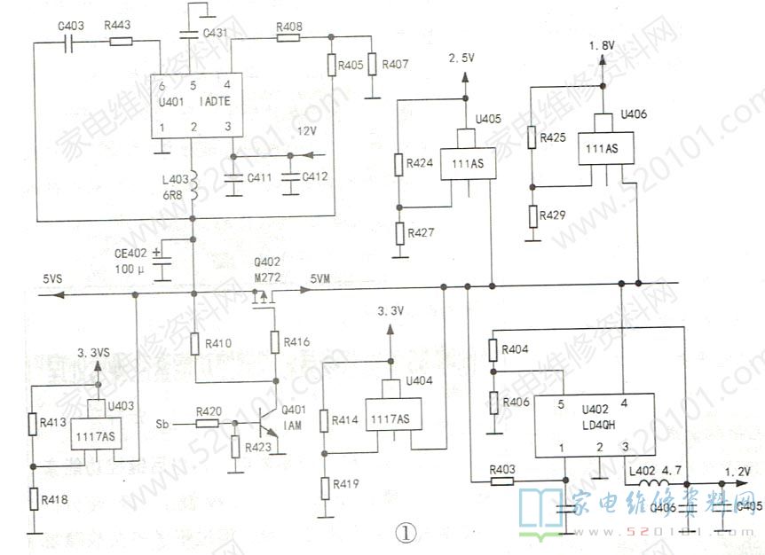 5Vsb经U403产生待机3.3Vsb。主芯片通过控制P沟道场效应管Q402导通与否来实现开/待机控制。开机时,主芯片输出高电平,Sb端电压为3.2V ,Q401饱和导通,Q402因栅极电压约为0V而导通,输出5VM电压,随即产生3.3V、2.5V、1.8V、1.2V电压。待机时,Sb端电压为0V,Q401.Q402截止。每次交流上电,在主芯片内的CPU完成时钟振荡、复位后,主芯片就输出3.2V电压到Sb端子,持续约5s。系统在这5s内完成对有关电路的检测。检测完成后,主芯片。输出0V电压到Sb端子,电视处于待机状态。