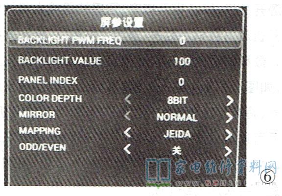 按照上述方法进入总线,将"MAPPING JP"项的值改为“JEIDA" ,如图6所示,图像彩色恢复正常。调整中发现背光亮度偏暗,试将"BACKLIGHT VALUE"的值调为*90" ,背光亮度增加,此时测量背光LED灯条两端电压由原来的55V增加到57V。退出工厂模式,该机故障彻底排除。
