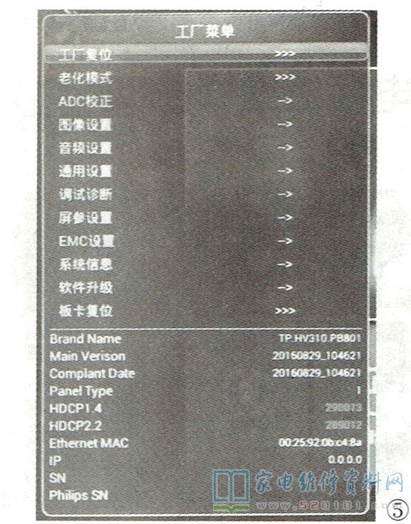 接下来决定调整屏参值试试。先按遥控器上的“菜单"键,屏显主菜单期间依次按遥控器的数字键“1、1、4、7"进入工厂模式,如图5所示。