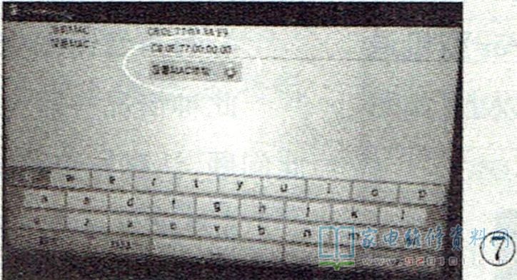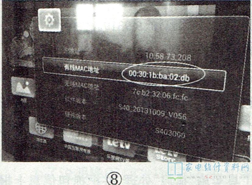 设置MAC地址(将机器原来本身的MAC地址写入,不要缺少冒号):按上下键选择设置MAC,再按“确认”键,屏幕下方出现字母和数字框,正确输入字母、数字及冒号,随后按“返回”键,字母和数字框消失点击“设置MAC地址”,见图7所示的圈中,提示关机重启,MAC地址改写完成(注意:在输入字母和数字时,需要不断转换确认键和返回键)。最后从“系统设置”一“关于本机”一查看“有线MAC地址”是否与本机原来的MAC地址(本机后壳标签)一样,若是,说明修改成功,否则需重新写入,如图8所示。