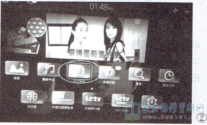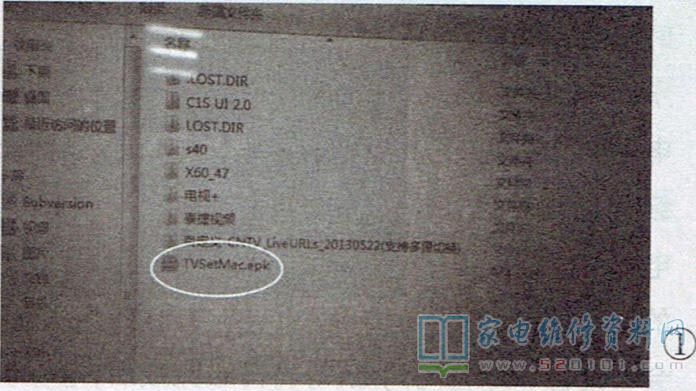 首先将文件TVSetMac.apk,拷至U盘根目录下,如图1所示,插入电视机左后侧USB接口。然后打开电视按“主页"键,选择“文件管理”->“确定”,如图2所示。