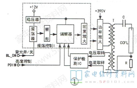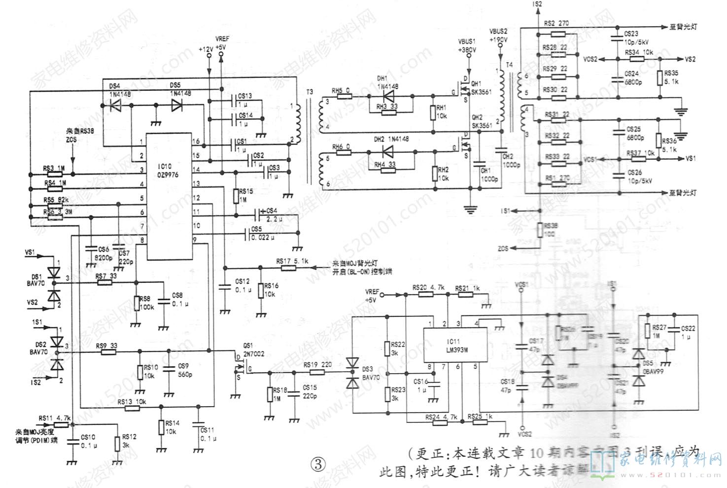 主电源工作后,输出的+12V电压送到背光振荡控制块IC10( OZ9976 )的电源端⑤脚。电源PFC电路送出的VBUS1 (约+380V )VBUS2(约+190V)电压分别加至开关管QH1的D极和升压变压器T4初级绕组①脚。若此时主控芯片MCU的BL-ON(背光灯点亮控制)端与PDIM(亮度调节)端,分别送来高电平及荧屏所需最低占空比PWM信号,背光控制与驱动电路开始工作,IC10①、⑥脚轮流对外输出开关脉冲信号开关变压器T3①-②绕组中有交替的脉冲电流流过->T3次级③-④、⑤-⑥绕组中将轮流产生相位相反的感应电压->QH1、QH2轮流导通或截止->T4初级①-②绕组中有交变电流通过->T4 次级③-④、⑤-⑥绕组中产生约1200V左右的感应电压,点亮背光灯管。当输给灯管的交流高压升高时,经电容CS23、CS24(或CS25 CS26)分压,得到vCS2(或vCS1),通过RS34(或RS37)输出的VS2(或VS1)检测电压将升高。检测电压通过DS1及RS7、RS8分压后加至IC10过压检测端⑧脚,IC10内部的脉宽调制电路使①⑥脚输出的开关脉冲宽度变窄->T3次级绕组输出的开关脉冲宽度也变窄->QH1、QH2导通时间缩短->T4的能量注入减少->T4次级输出的高压降低,从而保持输出电压基本不变。另外,T流过背光灯管的电流经电阻RS2、RS28~RS30、RS1、RS31~RS33转换成检测电压IS2、IS1,通过DS2及RS9、RS10分压后加至IC10电流检测端⑨脚。IC10内部的脉冲相位控制电路使①脚、16脚输出的脉冲相位差发生变化-+T3次级绕组输出的开关脉冲相位差也随之改变->QH1、QH2 G极的脉冲占空比随之改变→背光灯管的电流基本保持恒定。当调大背光亮度时, 主板送到IC10⑦脚的PWM亮度控制信号占空比增大->IC10①、16脚输出的激励脉冲的占空比增大->QH1、QH2G极的脉冲占空比增大->T4次级输出的交流高压升高->背光变亮。