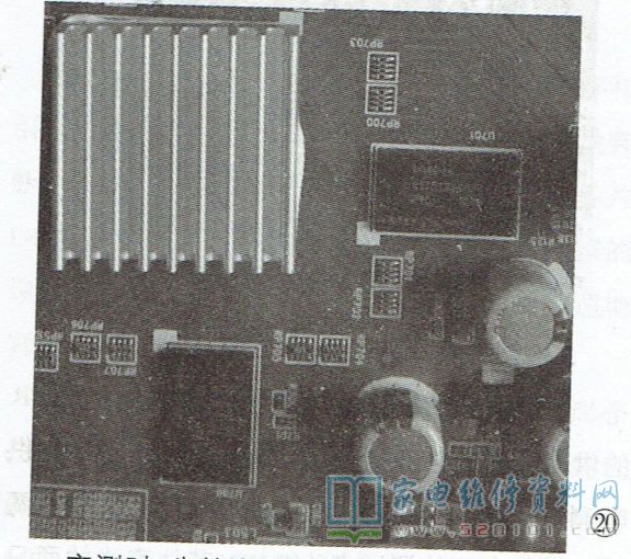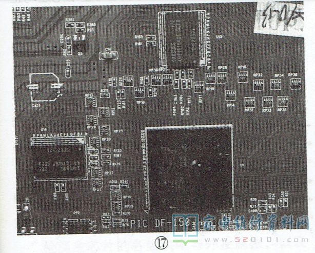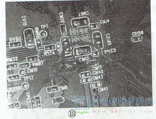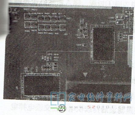 若这部分线路受潮,或线路上的灰尘油污过多,易引起线路间漏电,导致DDR与主芯片的数据交换异常,从而出现不开机、开机困难或无规律自动关机等现象。实修时,可先清除该线路上的杂物,再用吹风机烘干此部分线路,如此往往能起到事半功倍的效果。另外,由于DDR及主芯片引脚较多,且多采用BGA封装,加之主芯片工作时发热比较厉害,所以DDR及主芯片引脚虚焊现象较多,尤其是主芯片。在补焊主芯片与DDR后,需检查DDR与主芯片之间的排阻,以及主芯片背面的贴片元件引脚有无脱焊现象,如图18所示。
