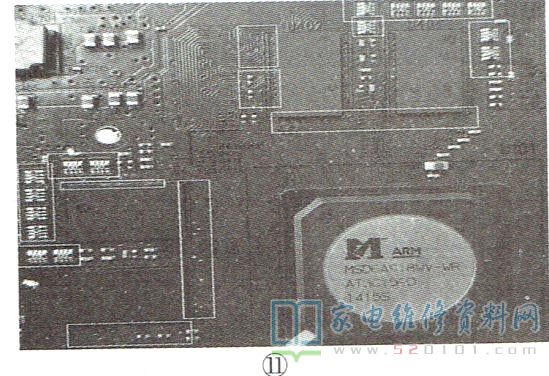 另外,有些机型在出现上述图像异常故障时,伴音中还夹杂有刺耳尖叫声。在智能平板彩电中,主板上通常安装有两片、四片甚至更多片DDR,如图11所示,这是因为在这类彩电中,DDR不仅参与解码,还参与CPU控制。智能彩电在开机启动或运行某些功能(如上网、点播、游戏等)时,数据量非常大,并会产生大量随时调用的中间数据,仅靠CPU和FLASH(闪存)是难以完成的,这时需要DDR参与其中,并将FLASH中的程序调入到DDR中运行,从而确保程序顺利运行。