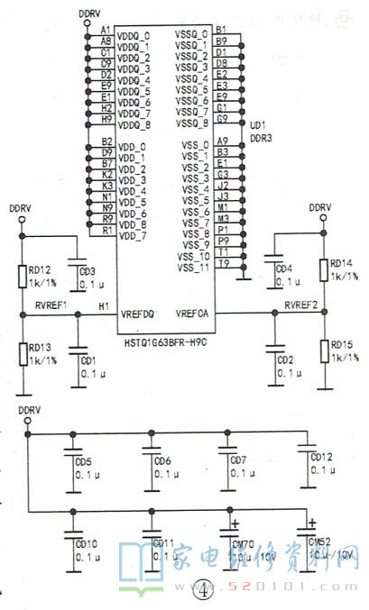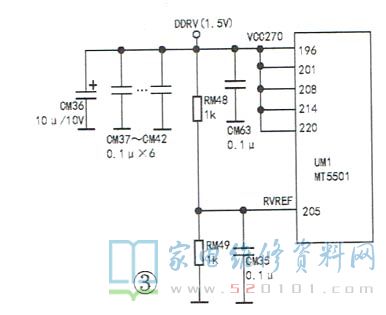 在平板彩电主板电路中,通常由一个DC-DC电路或低压差稳压电路(LDO)产生DDR供电电压(DDRV),该电压不仅供给主芯片内部的DDR,还分别供给主芯片外挂的每一片DDR。DDR的基准电压均由DDR供电分压得到,其值为DDR供电的一半。例如:主芯片MT5501设有5个供电端和一个基准电压端,如图3所示;外接的每片DDR均有多个供电端和两个基准电压端,如图4所示。