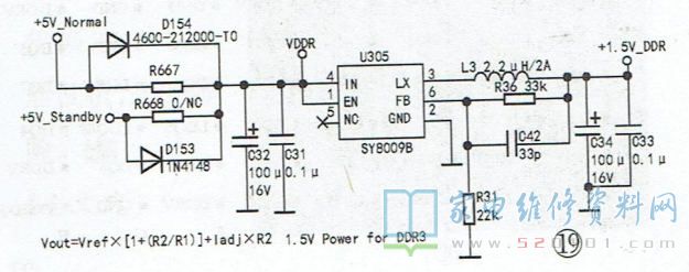 若确认DDR电路工作异常,则先检测DDR的供电与基准电压再检查通讯电路。DDR的供电测试点为DDR芯片旁边的贴片滤波电容两端,基准电压的测试点为DDR芯片旁边的两只分压电阻(有的位于主板的正面,有的位于主板背面)的连接点。若一时难以找到DDR的供电测试点,可先找到给DDR供电的DC-DC电路或低压差稳压电路,如图19所示,电源板送来的+5V_ Standby电压(待机时)或+5V_ Nomal电压(二次开机后),经U305(SY8009B )DC-DC变换得到+1.5V_ DDR供电;然后根据其输出电压的线路走向进行查找。提示:若DDR供电纹波较大(故障现象通常为图像上有点状干扰线或开机困难、死机等),可先找到给DDR供电的DC-DC电路或低压差稳压电路,在其输入输出电压滤波电容两端各并联一只100uF/16V的电解电容即可。DDR通讯电路中通常串有排阻,排阻两端分别同DDR与主芯片数据端或地址端相连。因此,排阻引脚为DDR通讯电路的测试点。若DDR通讯电路中无排阻,则测试点为靠近DDR及主芯片数据端或地址端的过孔,如图20所示。