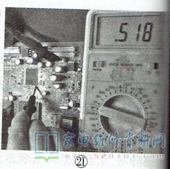 实测时,先检查排阻引脚有无开焊现象,再对比测量排阻中各电阻有无开路现象。接下来将数字万用表置于二极管挡,红表笔接地,黑表笔接上述通讯电路的测试点,如图21所示。正常时,万用表的读数在0.5~0.6之间。若实测值偏离该范围,就可判断此路异常:若偏大,通常为通讯电路中的过孔不良(过孔不通或时通时不通);若偏小,通常为DDR或主芯片相关引脚短路。