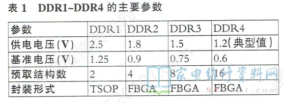 目前,DDR芯片技术已发展到了第四代,即DDR4。这四代DDR(DDR1~DDR4 )的供电、基准电压等主要参数均不相同,具体值见表1。