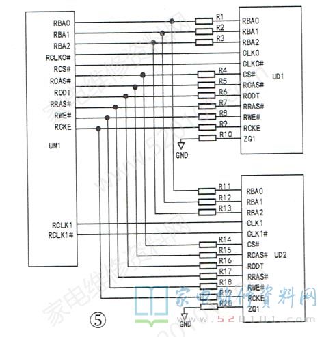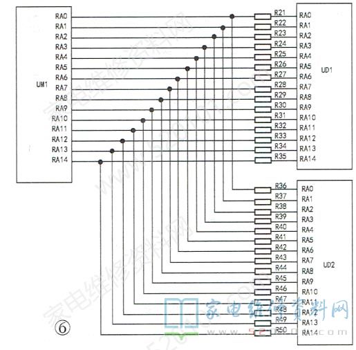 地址线中传输的是地址信号。在控制信号的作用下,系统根据地址信号对交换的数据进行准确寻址,从而确保数据传递的准确性。在主板图纸上,地址线号一般以RA或MA开头,如图6所示,RAO~RA14就是DDR的15条地址线。