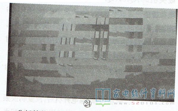 例2:一台TCL-L52E9FE型液晶彩电(MS91C机芯),图像上有马赛克,如图24所示。分析检修:根据故障现象分析,此故障的原因应是DDR (U304)异常,或者DDR与主芯片U300之间的通讯不畅。检查DDR的供电与基准电压均正常,怀疑DDR和U300虚焊,按压DDR和U300,故障现象不变,补焊后故障依旧。代换DDR后无效,代换U300后故障排除。