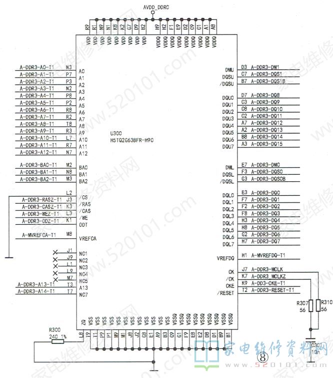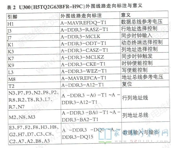 主芯片与DDR的数据端通常直接相连,对交换的数字信号进行传输。数据线一般以RDQ或MDQ开头,如图7所示,RDQ0~RDQ31就是DDR的32条数据线。需说明的是,在实际检修DDR电路时,除了能在图纸上识读DDR的引脚功能外,还需识读DDR引脚的外围线路走向标注,这样才能快速地找到DDR引脚的外接元件,尤其是与主芯片相连的引脚。识图时,需从DDR外围线路走向标注中找出关键字母,从而判断出该条线路的功能与去向。例如:在创维50E760A型液晶彩电( 8S06机芯)中,主板上共有4片容量为2GB的DDR3(位号为U300~U303,型号均为H5TQ2G63BFR一H9C),用于装载与运行主程序及信号数字处理过程中的中间数据。其中,U300的外围线路走向标注如图8所示,具体意义见表2。