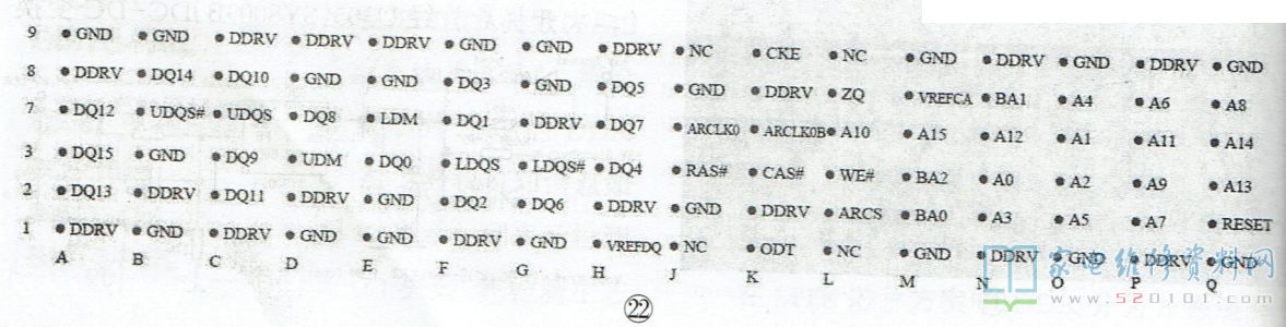 若要准确地判断通讯电路异常的故障原因,可拆下DDR进行测量。图22 一块DDR3印制板测试点,有多个供电端,两个基准电压端,A0~A15共16个地址端,DQ0~DQ15共16个数据端。正常时,相同类型(如供电、基准电压地址或数据)引脚的在路电阻值应相同。若不相同,则表明该端外围线路有问题。在康佳TCL部分液晶彩电中,因印制板的质量问题DDR通讯电路中的过孔不良现象较多。