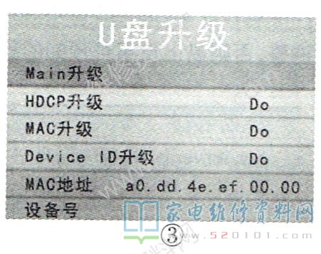 先进入工厂模式,在主菜单中找到“U 盘升级"并打开,如图3所示。"Main升级"项用于升级主程序和Mboot(引导程序), "HDCP升级”用于高带宽数码内容保护设置,"MAC升级”项用于更改机器的MAC地址(即主板的网络物理地址), "DeviceID升级”用于设置电视机的ID号(即设备标识符)。