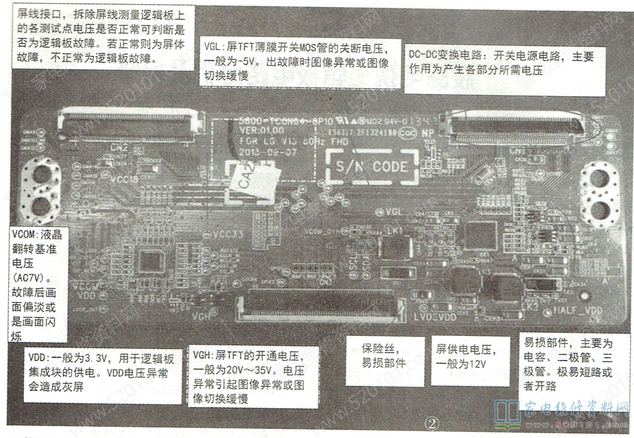 小结:通过实际维修,发现逻辑板的VGH、VGL电压故障率较高,尤其是VGH电压,所以请大家在检修此类故障时,要重点检查VGH电压是否正常,以便少走弯路。