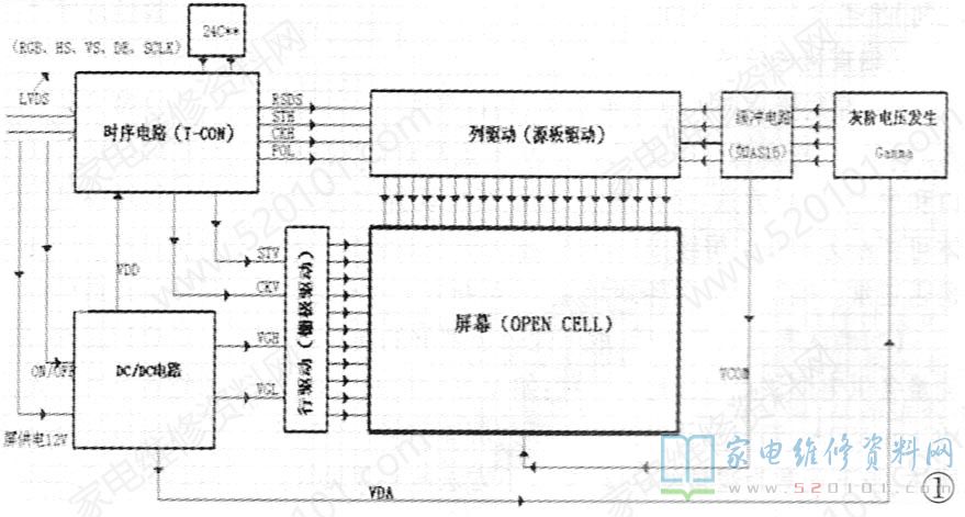 1、时序电路:核心电路,控制扫描驱动的启动,并将数字LVDS视频信号转化为数据信号形式。