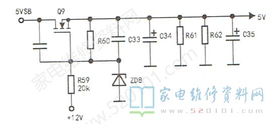 接修一块液晶彩电电源板(板号为SHG3202H-155S),通电后只有+5VSB电压正常,其他输出电压为0V,很快查出肖特基二极管D10(SB5200)短路,此二极管为+12V整流管。用手头两只SB3100型二极管并联代之,强制开机,+24V、+12V电压均正常。由于电源板在拿来时,Q9( BA3811)一个引脚断裂,无法再用。分析电路,Q9只是起开关通电作用,二次开机后输出+5V电压给主板,如图1所示。