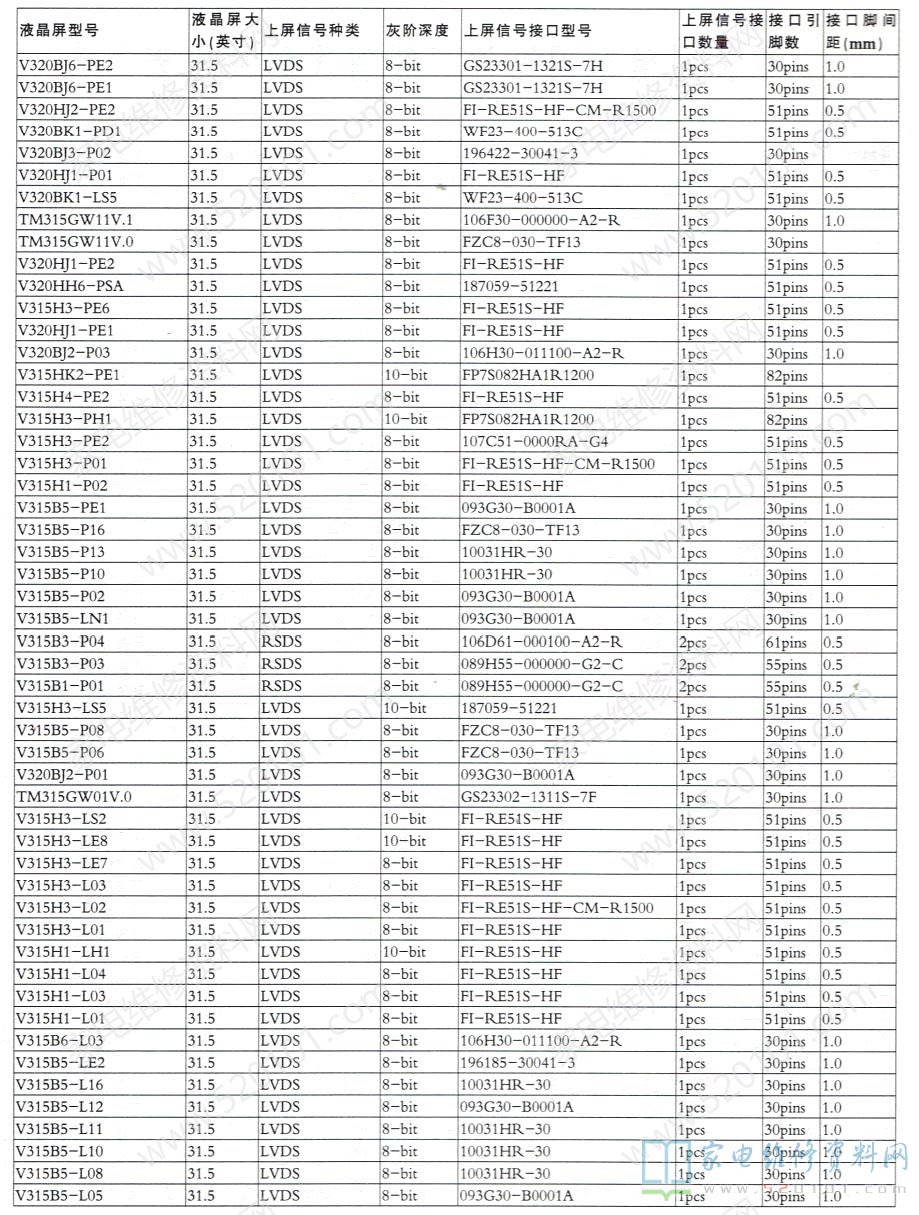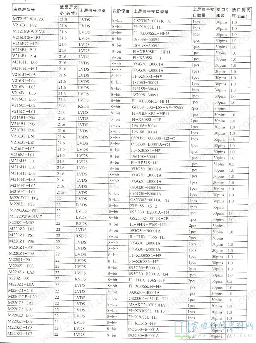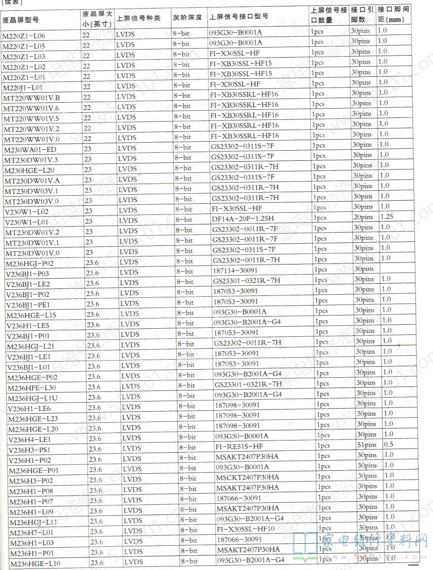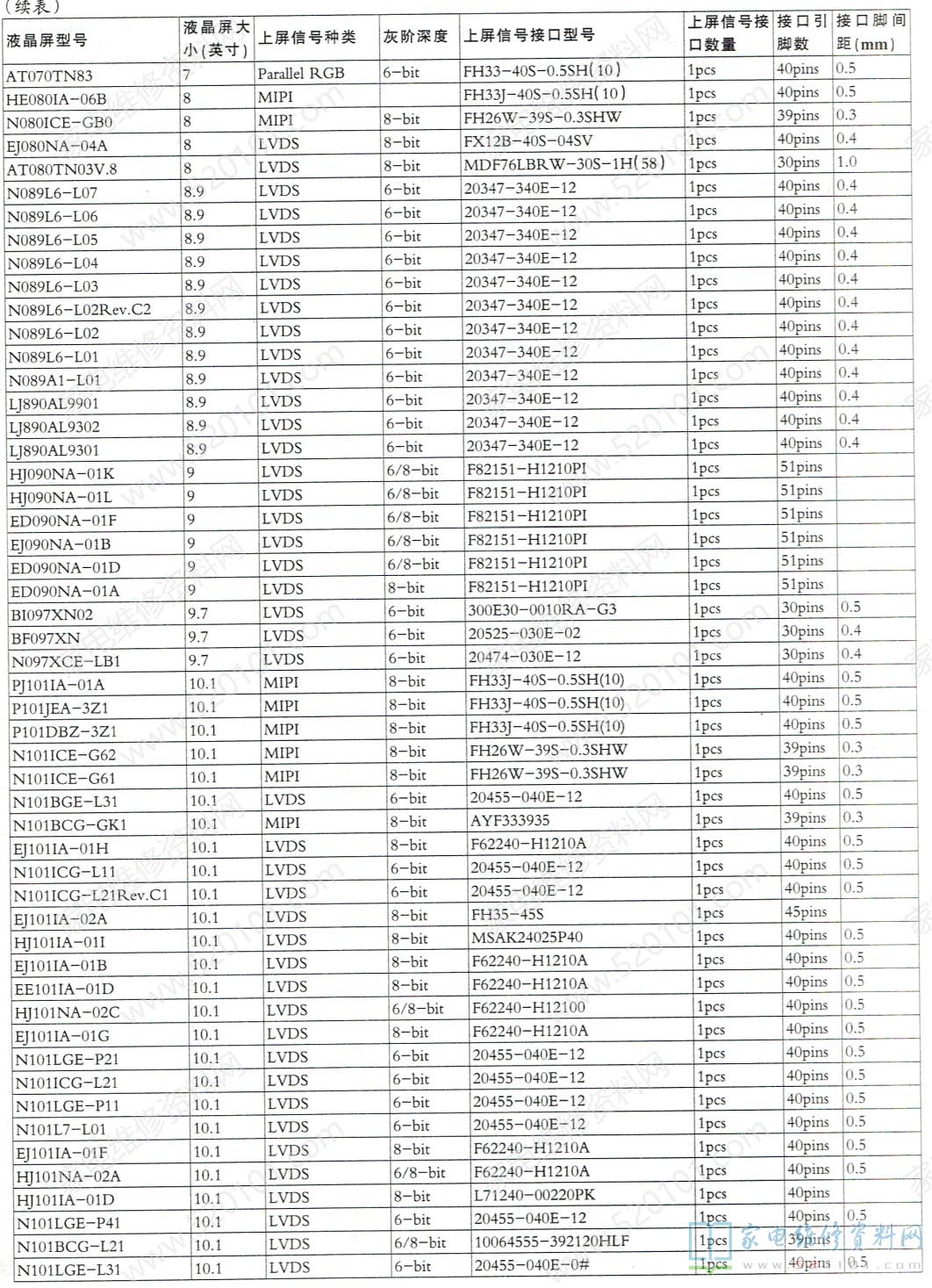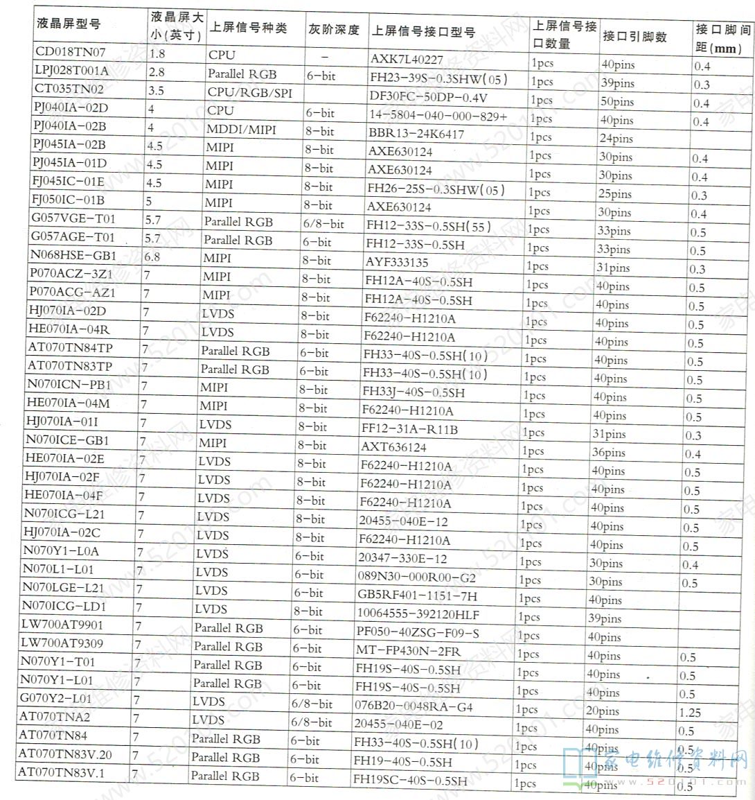 本表说明:1.在上屏信号种类中,"MIPI"的全称是Mobile Industry Processor Interface, 该接口是2003年由ARM.Nokia.ST、TI等公司成立的一个联盟,目的是把手机内部的接口(如摄像头、显示屏接口、射频/基带接口等)标准化,从而减少手机设计的复杂程度,并增加设计灵活性。"LVDS”的全称是Low-Voltage Diferential Signaling, 表示低电压差分信号。“eDP” 的全称是EmbeddedDisplayPott,是一种支持嵌入式数码音视讯传输接口。“Parallel RGB”表示并行RGB信号。“V-by-One”接口的意思是题,现主要用于超高清的大屏幕液晶屏中。2.在 上屏信号接口数量一列中,"pcs"表示单位“个”。