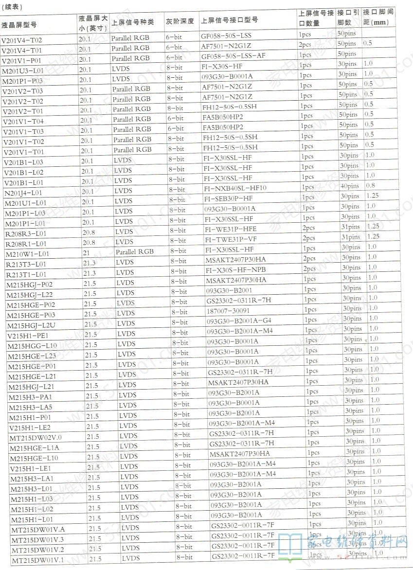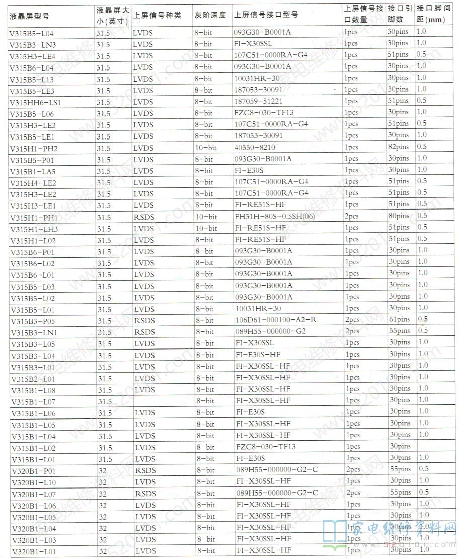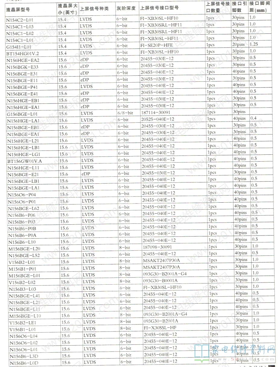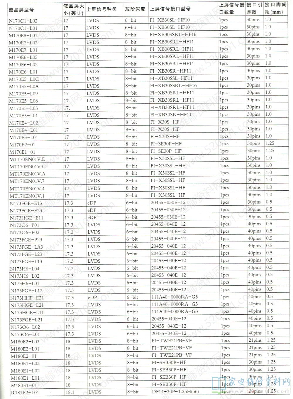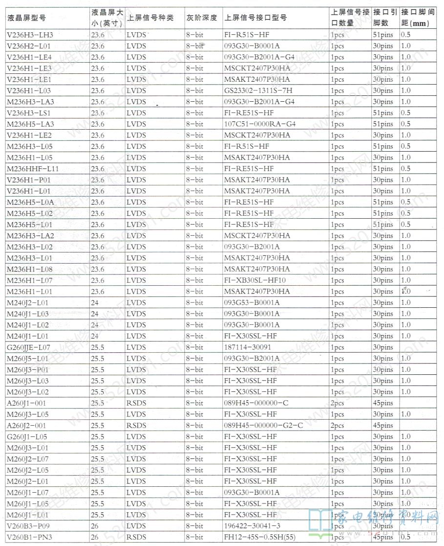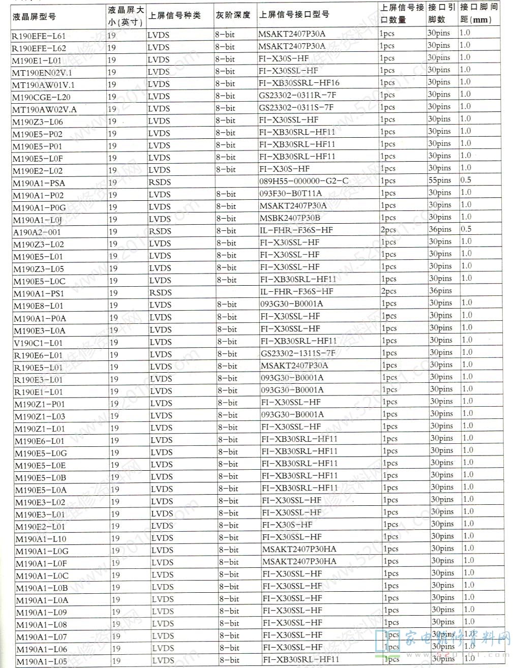 本表说明:1.在上屏信号种类中,"MIPI"的全称是Mobile Industry Processor Interface, 该接口是2003年由ARM.Nokia.ST、TI等公司成立的一个联盟,目的是把手机内部的接口(如摄像头、显示屏接口、射频/基带接口等)标准化,从而减少手机设计的复杂程度,并增加设计灵活性。"LVDS”的全称是Low-Voltage Diferential Signaling, 表示低电压差分信号。“eDP” 的全称是EmbeddedDisplayPott,是一种支持嵌入式数码音视讯传输接口。“Parallel RGB”表示并行RGB信号。“V-by-One”接口的意思是题,现主要用于超高清的大屏幕液晶屏中。2.在 上屏信号接口数量一列中,"pcs"表示单位“个”。