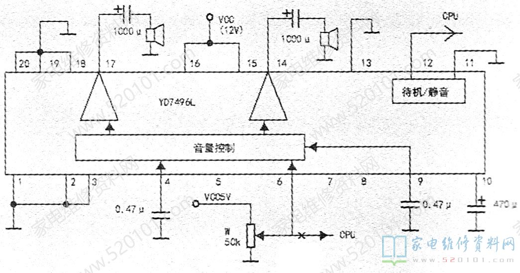 接修一台32英寸组装液晶电视,图像正常,但无声音。此机面板按键竟然无音量+/-按键,用万能遥控器也没有对上码。拆机查看,机内有一块主板和块背光板,主板上功放块采用YD7496L,其11脚待机端接地、⑥脚(音量控制)、12脚(静音控制)通往CPU。若要YD7496正常工作,⑥脚须有1V~5V电压,12脚应为低电平。现测得⑥脚电压始终为0V,判断可能是CPU或⑥脚外围电路有问题。用空心钢针把12脚悬空后,再用导线把12脚接地;⑥脚也悬空,外接一只50k电位器对+5V分压后送给⑥脚,如图1所示。