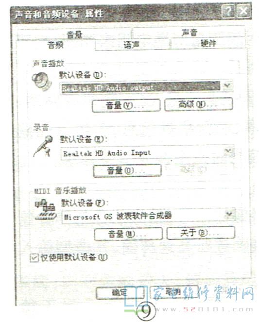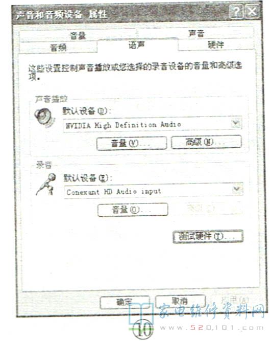 选择“声音和音频设备属性”选项并打开,如图9所示,在音频选项界面中,选择HDMI声音输出为默认设备即可。如果电脑主机采用的是带音频输出功能的显卡,则将声音播放中的默认设备选择为该显卡的音频设备名称即可,如“NVIDIA HighDefnition Audio" 等等,最后点击“应用”,如图10所示,通常情况下电视机就会有声音了。如果此时还是没有声音,可先进入电脑的BIOS设置,查看有无HDMI Audio (HDMI音频)选项,如有,其设置应为"Enable"(开启 ),最后进入语声选项卡,点击“测试硬件”即可。
