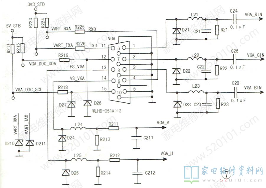 液晶彩电的VGA信号输入典型电路如图7所示。