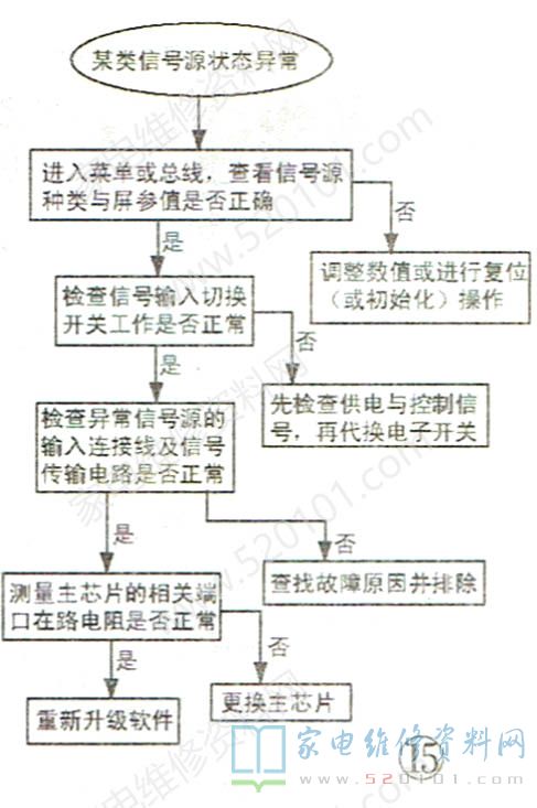 例如:一台海信液晶彩电,只要接 上VGA线(线的另一端并不连接电脑等设备),电视就自动关机。解决办法:进入总线,进行清空母块操作即可。综上所述,某类信号源状态异常故障的检修流程如图15所示。