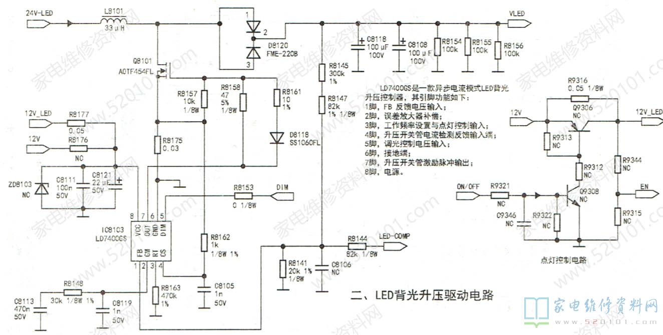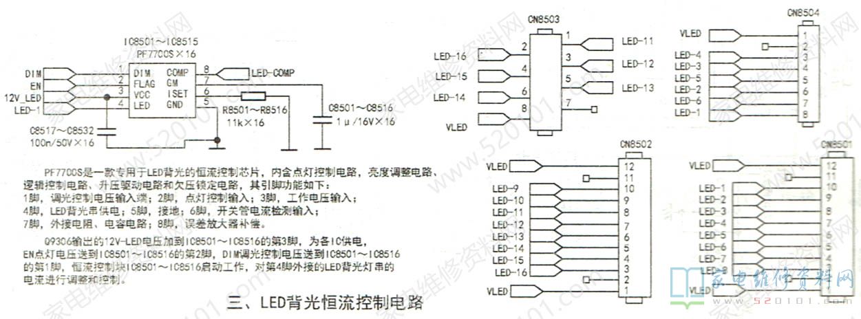 LED背光驱动电路由两部分组成:二是由驱动控制电路LD74006SC(IC8103)为核心组成升压电路。对24V-LED电压升压,输出VLED电压。为LED灯串供电:二是由16只集成块PF7700S(168501~1C8516)组成LED灯串电流控制电路,对LED灯串的负极电压进行控制,达到调整背光亮度和稳定LED灯串电流的目的。