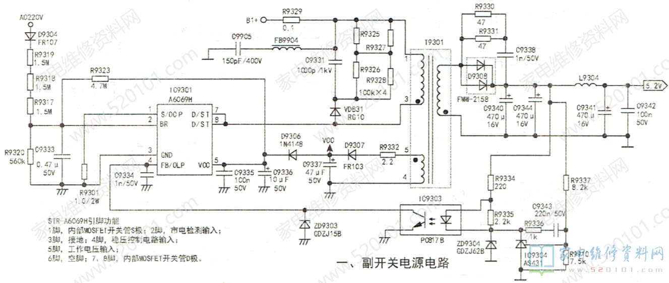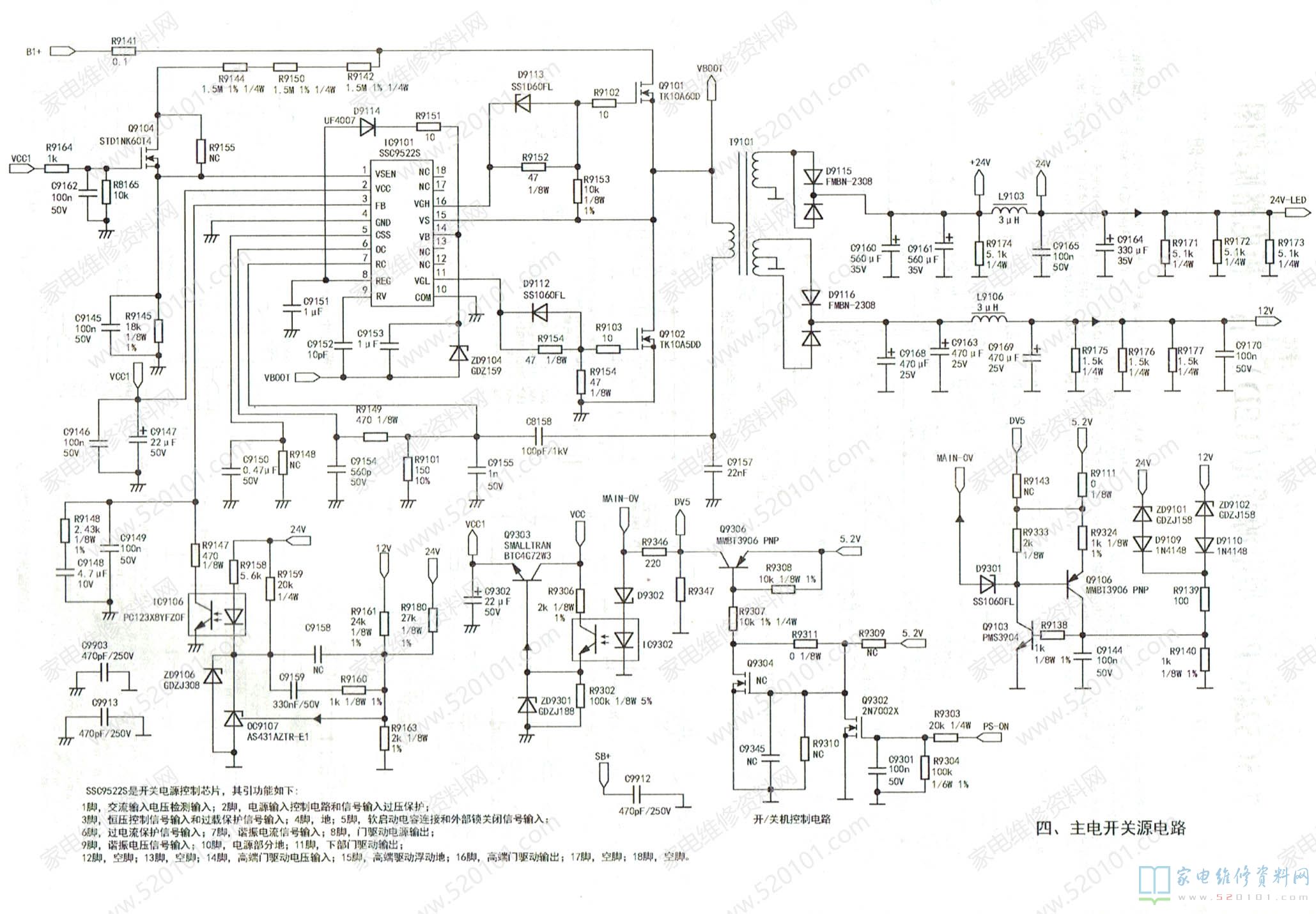 A6069H(IC9301)为核心组成副开关电源,产生5.2V和VCC电压,5.2V为主板控制系统供电,VCC电压经开/关机电路控制后为PFC和主电源控制IC供电;以集成路SSC9522S (1C9101 )为核心组反或的主开关电源,产生24V-LED、+12V电压,为主板和背光驱动电路供电。